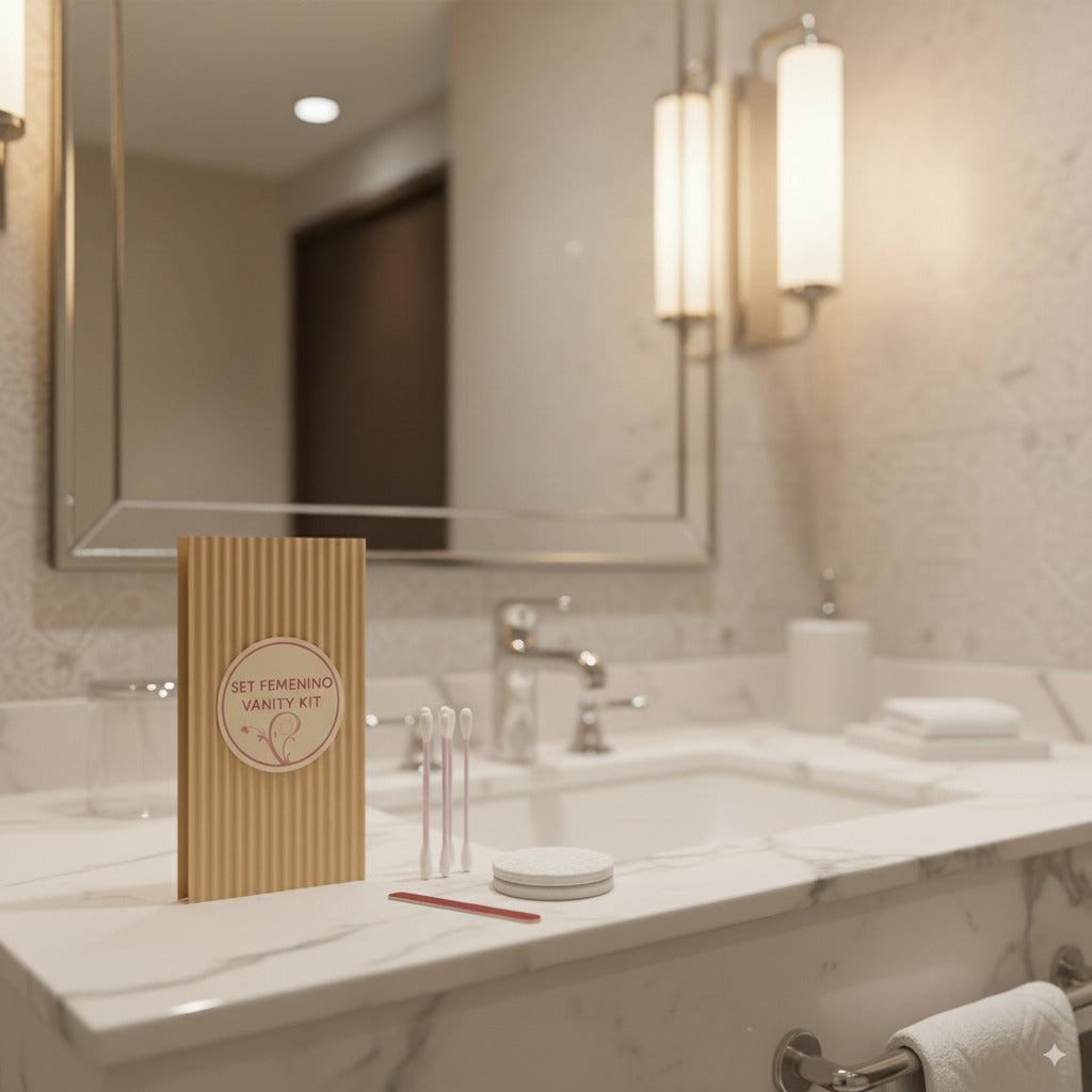 The Romero Female Set is a women's wholesale kit designed to offer guests a practical and complete personal care detail. Perfect for hotels, tourist apartments and accommodations looking for quality amenities designed especially for women.