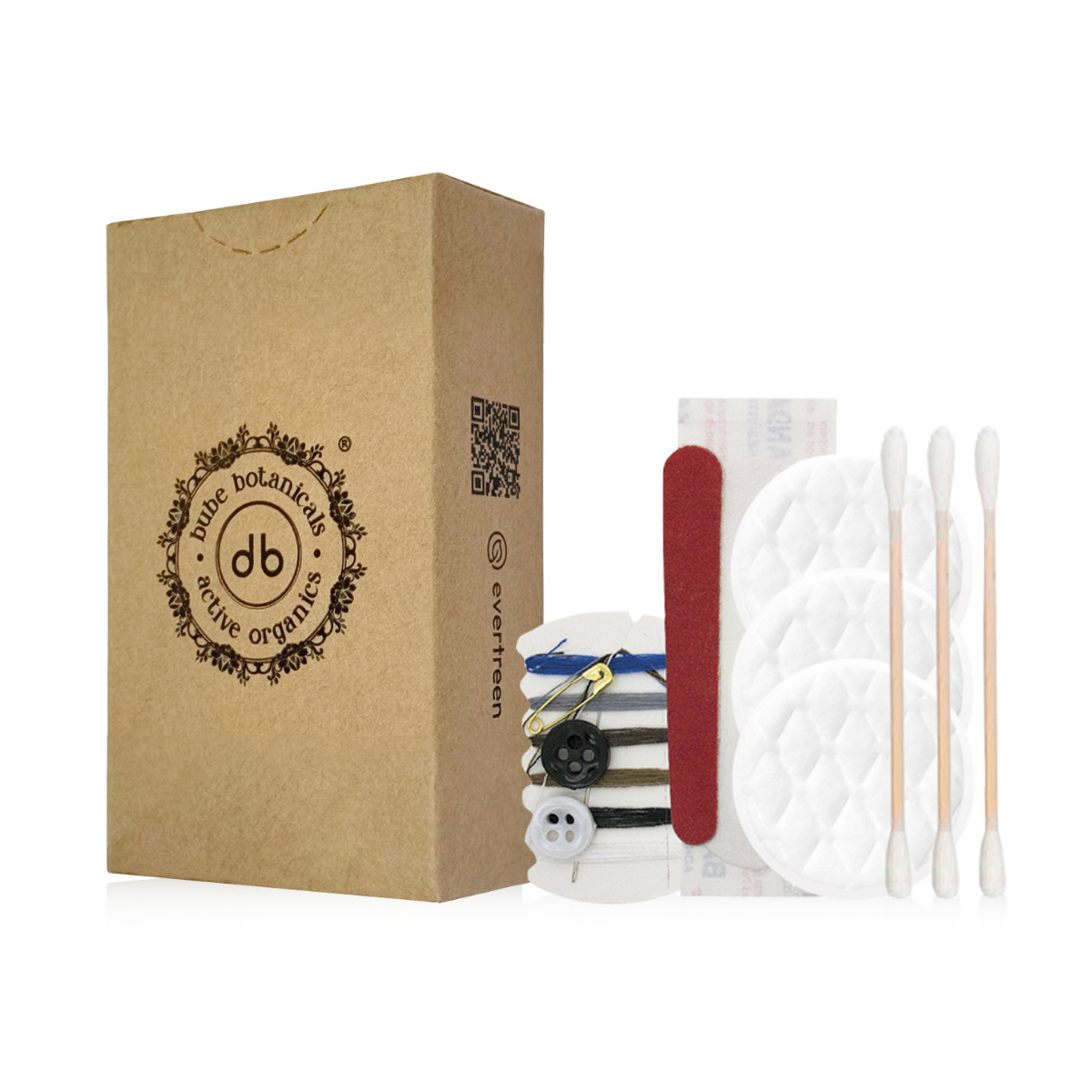 Trousse de toilette Bube dans un carton scellé contenant 8 articles : lime à ongles, pansements, kit de couture, disques de coton et cotons-tiges en bois, destinée aux chambres d'hôtel et au secteur HORECA