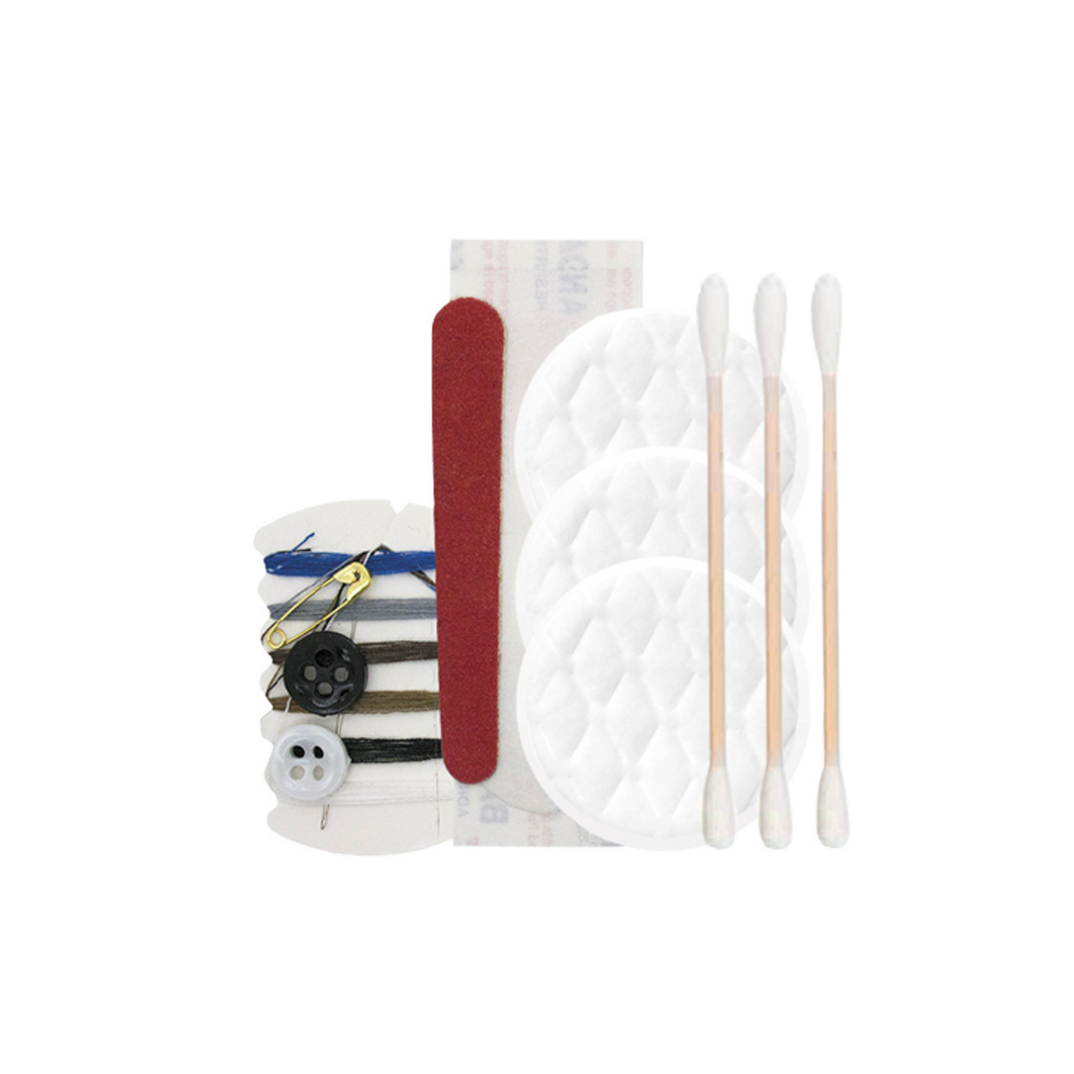 Kit de toilette d'hôtel Bube, 8 pièces : lime à ongles, pansements, trousse à couture, disques de coton et cotons-tiges en bois, dans une boîte en carton scellée, format grossiste (500 unités).