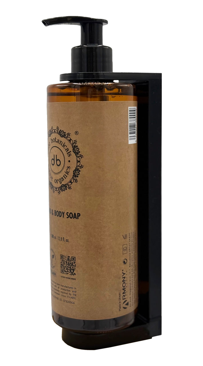 Gamma di flaconi dosatori da 380 ml della linea Bube, disponibili in quattro varianti: sapone per mani e corpo, shampoo, balsamo per capelli e lozione per mani e corpo. Realizzati in materiale RPET riciclato con valvola dosatrice di colore nero, offrono un aspetto uniforme e un design curato, ideale per i bagni degli hotel. Formato ricaricabile ideale per ridurre i rifiuti di plastica nelle camere e nelle aree comuni. Formula vegana con certificazione ufficiale, prodotte in Spagna.